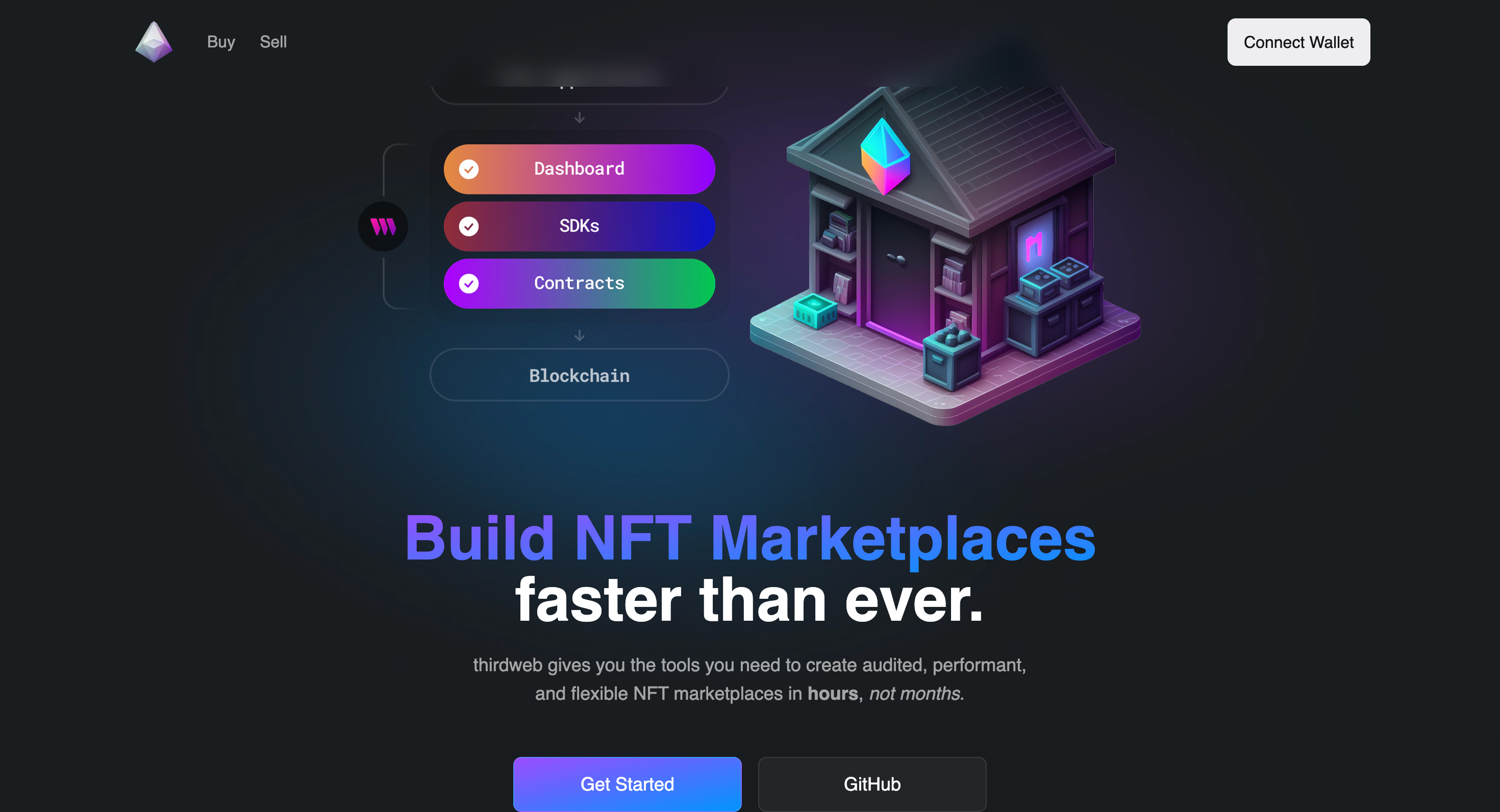 Thirdwebのマーケットプレイスコントラクトを使ったNFTマーケットプレイスのデモです。