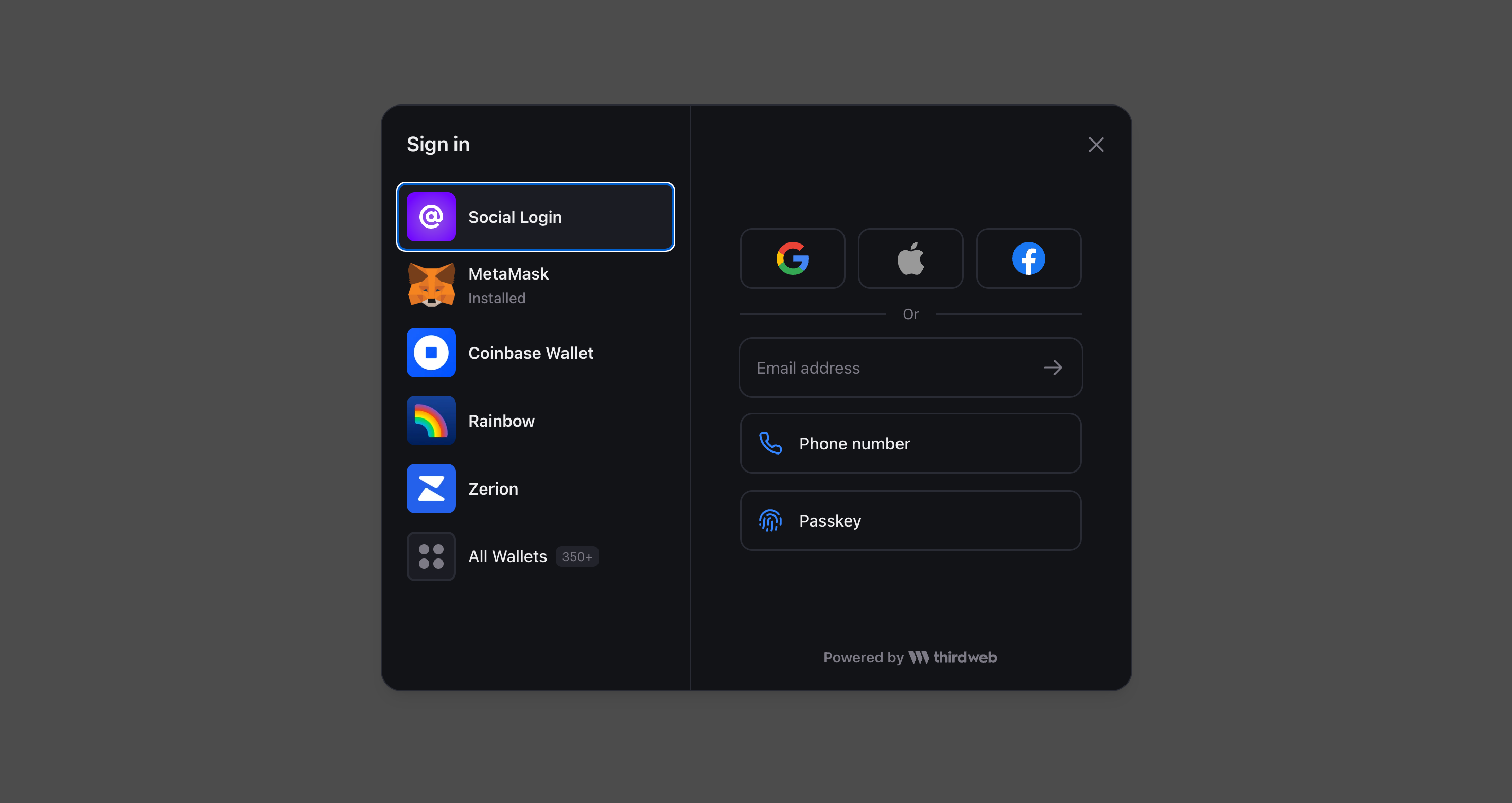Thirdweb Connectのデモサイトです。ソーシャルアカウントやEmailを使ったログインと、MetaMaskなどのウォレットログインの挙動、ログイン後...